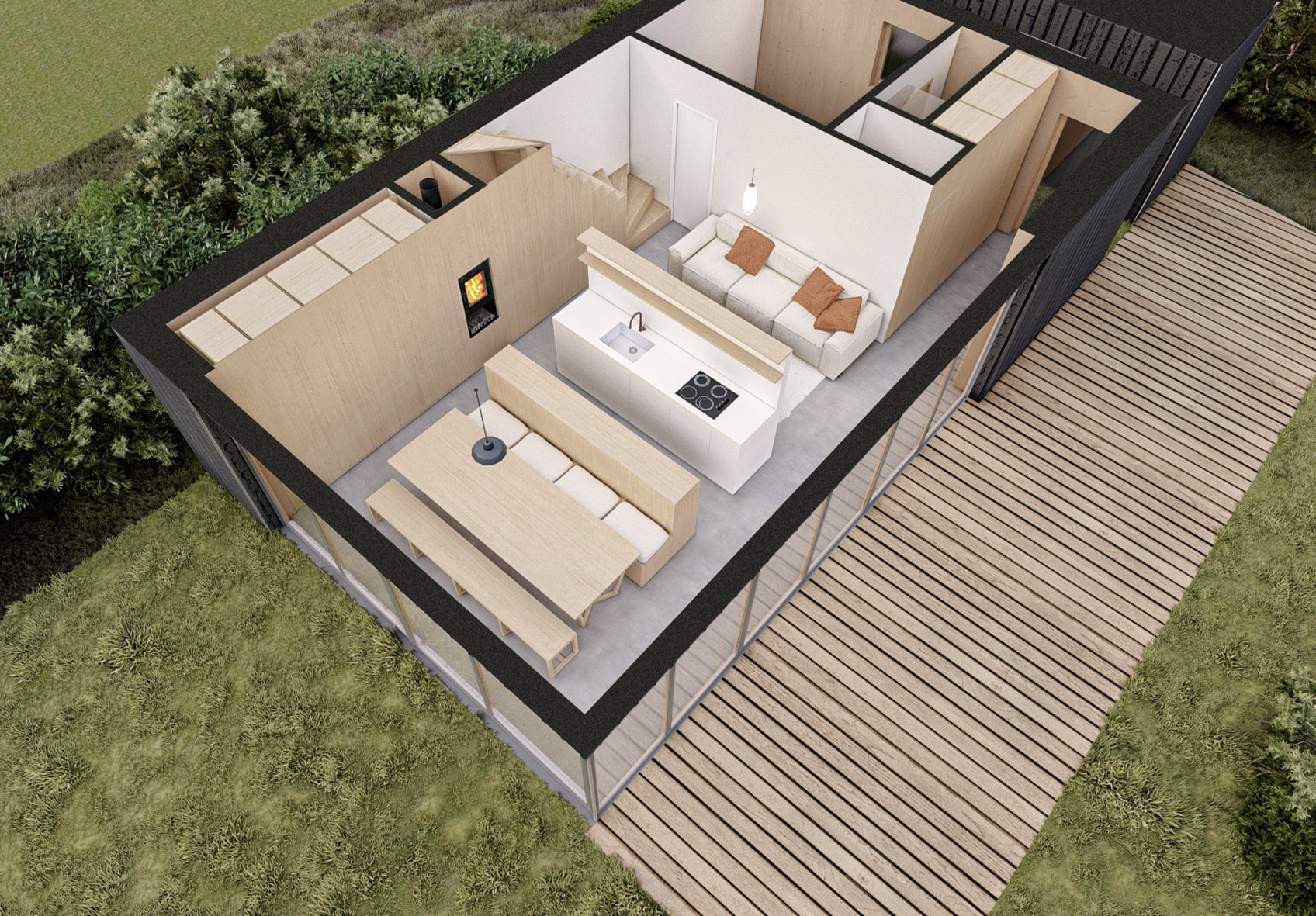 Tout en murs et charpente ossature bois, la maison accueille des isolants bio-sourcés tels que la ouate de cellulose ou la laine de coton. Le bardage bois naturel et vertical est teinté en noir avec de l’huile de lin, qui résistera aux vents d’Ouest marins.