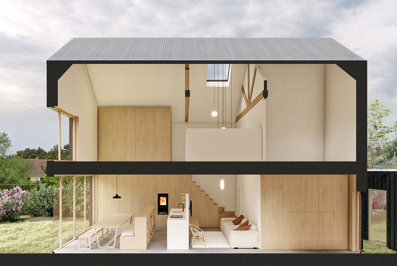 L’objectif de la conception de ce projet fut de conserver la qualité de la construction et la performance du PassivHaus avec un budget modéré. Pour se faire, la maison est dessinée très compacte et bien orientée : aveugle au Nord et totalement orientée Sud et Ouest.