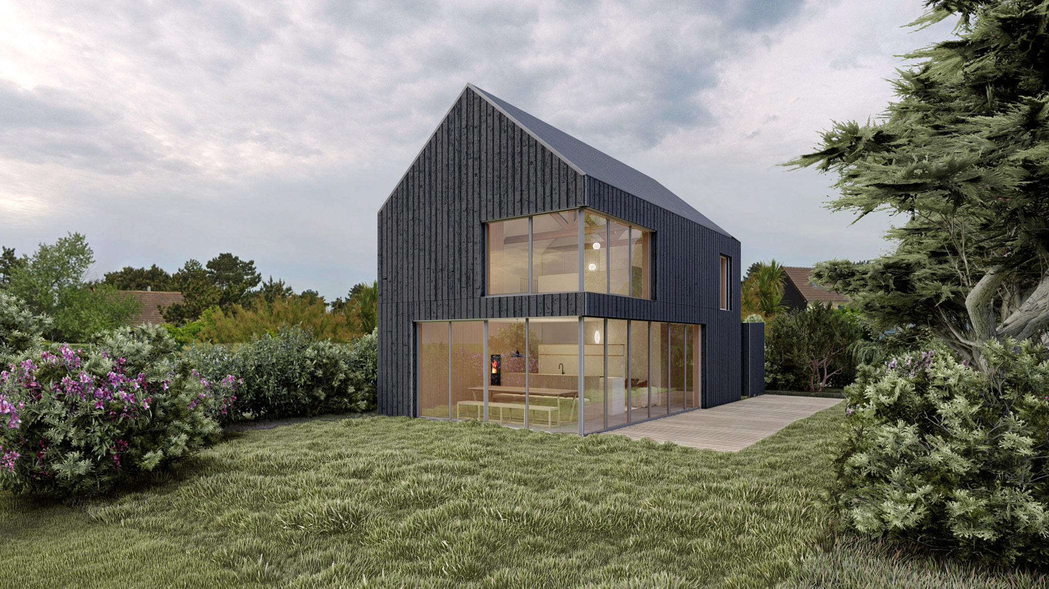 Cette maison tout en bois et matériaux biosourcés vient se poser sur un terrain nu, non loin des dunes de Portbail sur Mer.