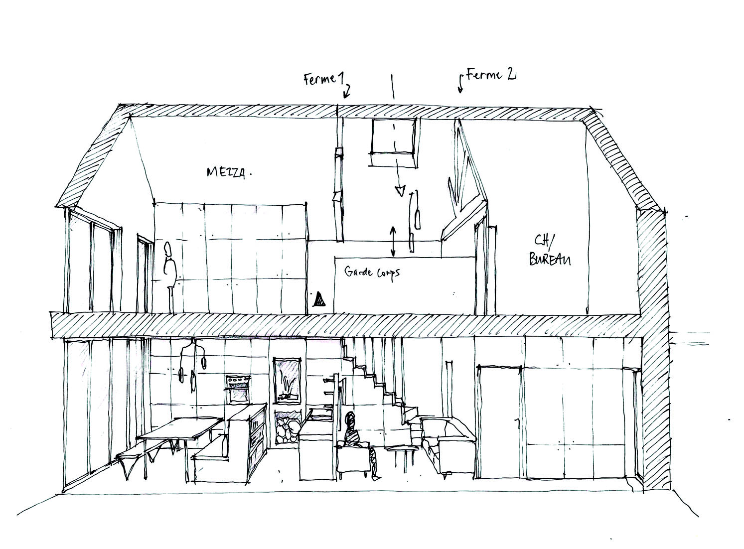 Une double hauteur au centre de la maison vient apporter de la respiration au dessus du salon et dynamiser les volumes intérieurs malgré une surface restreinte.