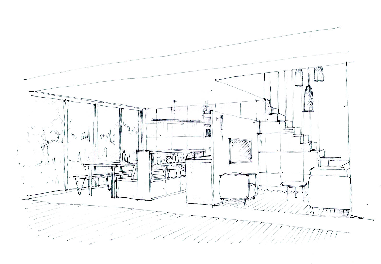 Le dessin de la cuisine/séjour est particulier : Le meuble central ilot-bar de la cuisine se retourne vers le séjour et forme la banquette d’assise de la table à manger. Ce meuble permet de réunir tous les usages nécessaires à ce lieu convivial dans un espace optimisé.