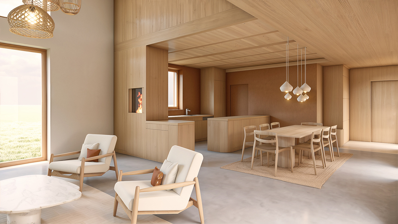 L’espace principal est ouvert entre la cuisine, le séjour et le salon. L’ambiance intérieure est chaleureuse, naturelle et intègre un poêle à bois au centre pour générer l’appoint de chauffage.