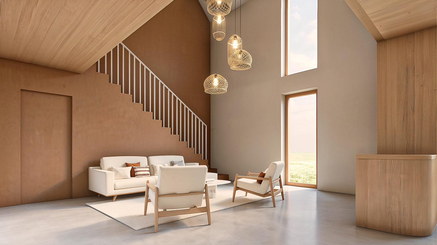 Une double hauteur sur le salon apporte une sensation de grandeur dans le volume traditionnel et permet à la lumière de se répartir dans tous les espaces de vie, au rez-de-chaussée comme à l’étage.