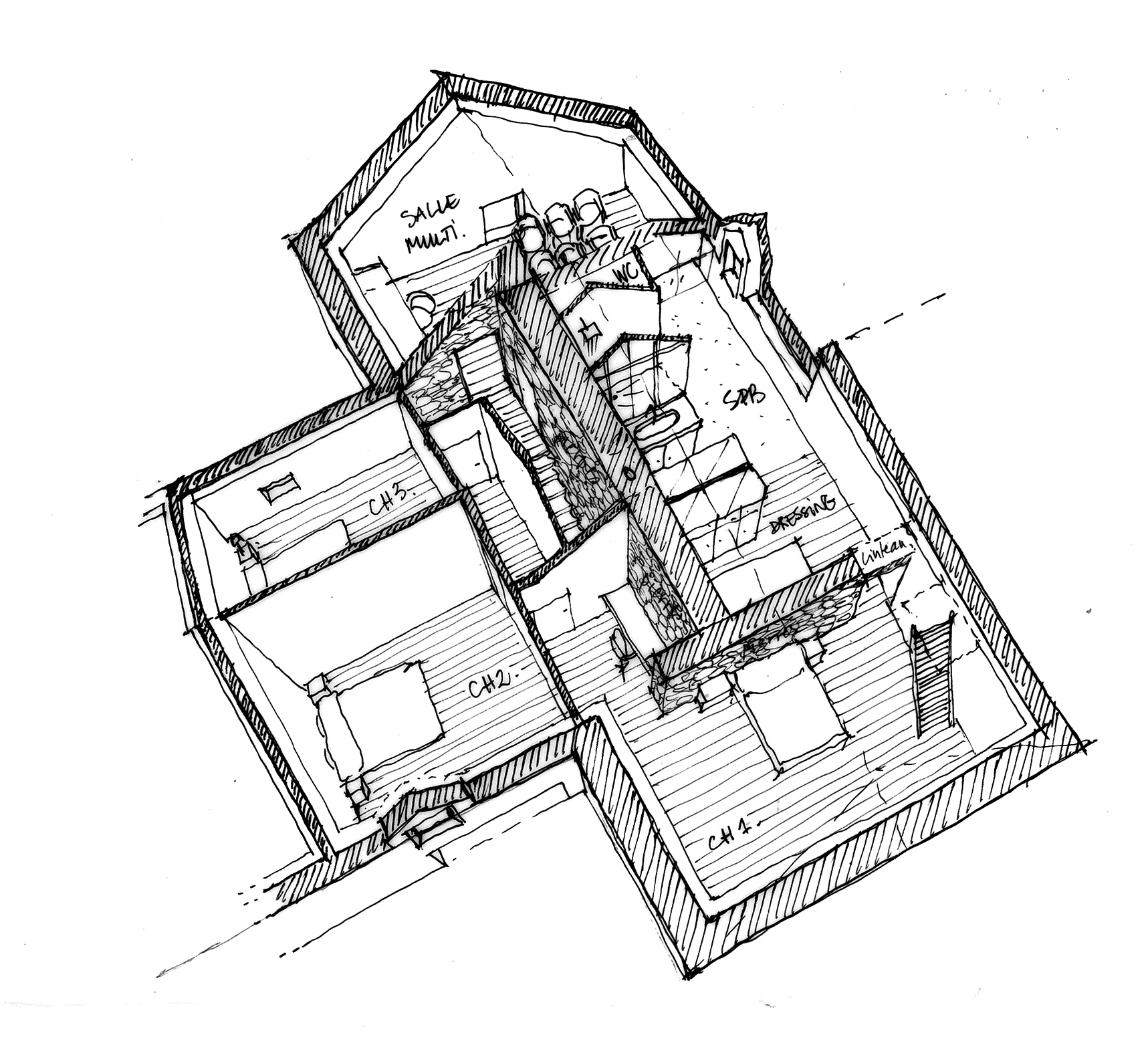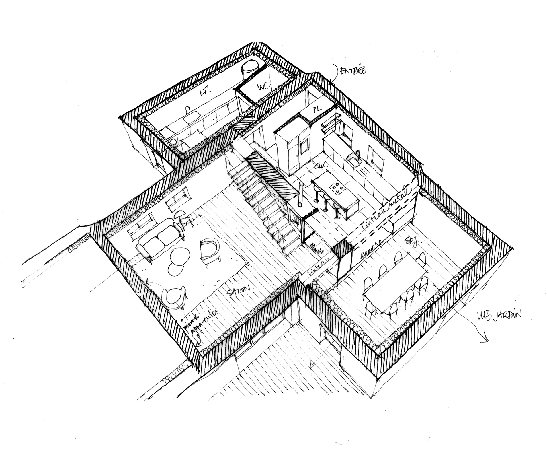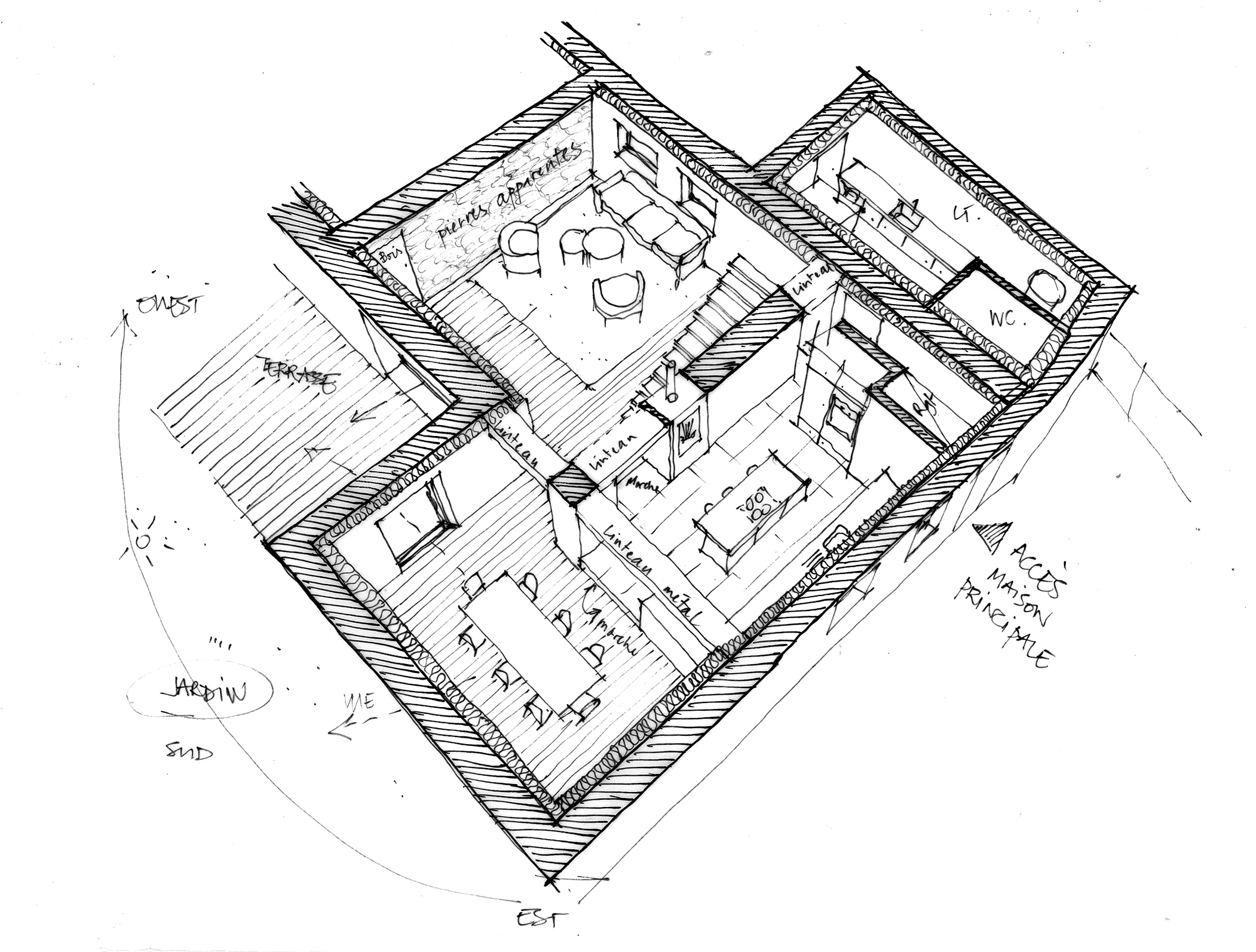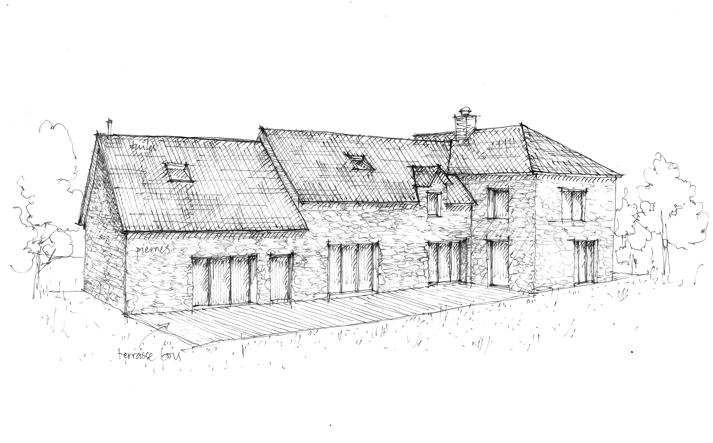 La partie principale deviendra la maison principale, en forme de L, avec en son centre un nouveau poêle à bois et un bel escalier donnant à voir un mur en pierres apparentes.